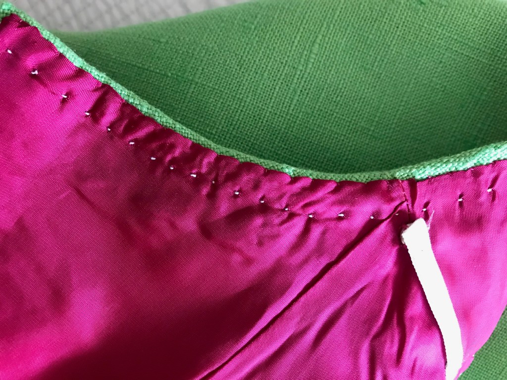 To keep with the early ‘60’s vibe, I decided to line it in pink. Although I usually line linen with a cotton batiste or cotton/linen lightweight blend, I decided to treat this dress a little bit differently. I do not often use Bemberg for lining, usually preferring silk, but this lovely, time-tested 100% rayon lining just seemed to be the right choice. (Why? I knew the seam allowances of the bright green linen would not show through the tightly woven Bemberg lining, AND it would be a comfortable, lightweight and slinky fabric with which to line a summer dress.) I ordered what I thought would be a medium pink, but when it arrived, it was more of a very deep rose. What to do? I hemmed and hawed, I thought about ordering a different hue of pink, I even thought about abandoning the pink idea and just using a white crepe de chine I had on hand. Why I was agonizing so much over the color of the lining had to do with my thought if the dress turned out well, I would enter it in the County Fair. I knew not everyone would “understand” such a deeply contrasted lining. But not wanting to waste money and fabric – and time! – I finally decided just to go with the dark pink, shown a few pictures below.