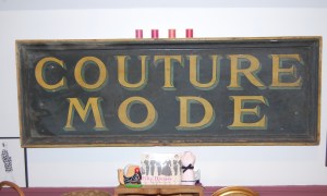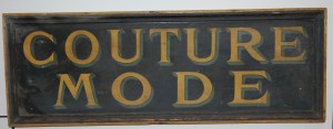 Then – I had a Eureka moment when I was on a “business” trip for the club early this past May, attending the Annual Meeting of the Garden Club of America. Among the perks of this Annual Meeting is a wonderful multi-vendor boutique, which is set up in the host hotel. One of the vendors specialized in French fashion jewelry. Although her jewelry was lovely, it was one of her props that caught my eye – a wooden sign, with the phrase “COUTURE MODE” spelled out in stylized block letters.