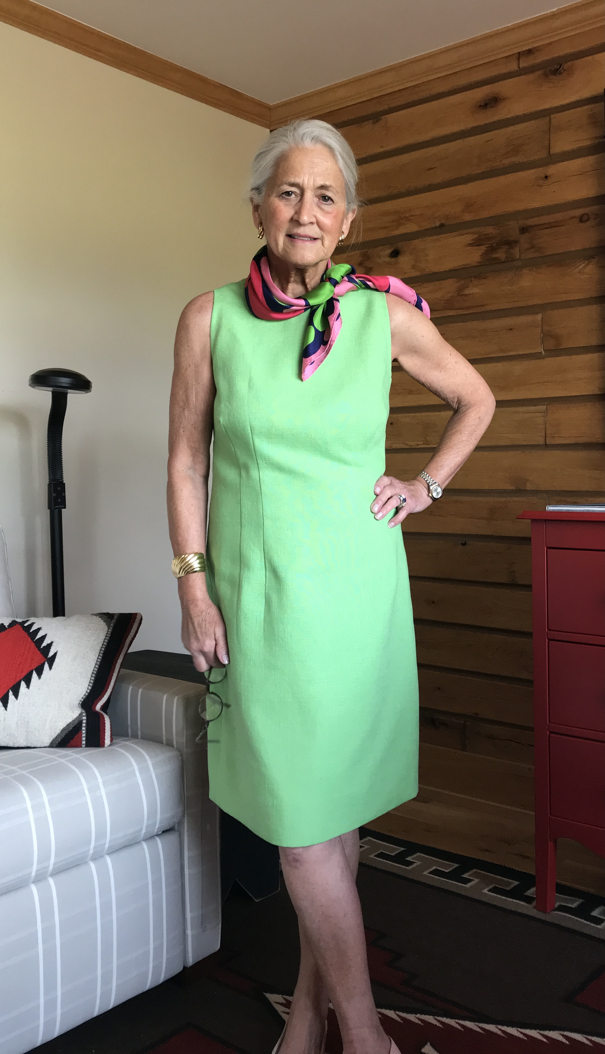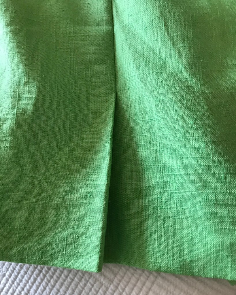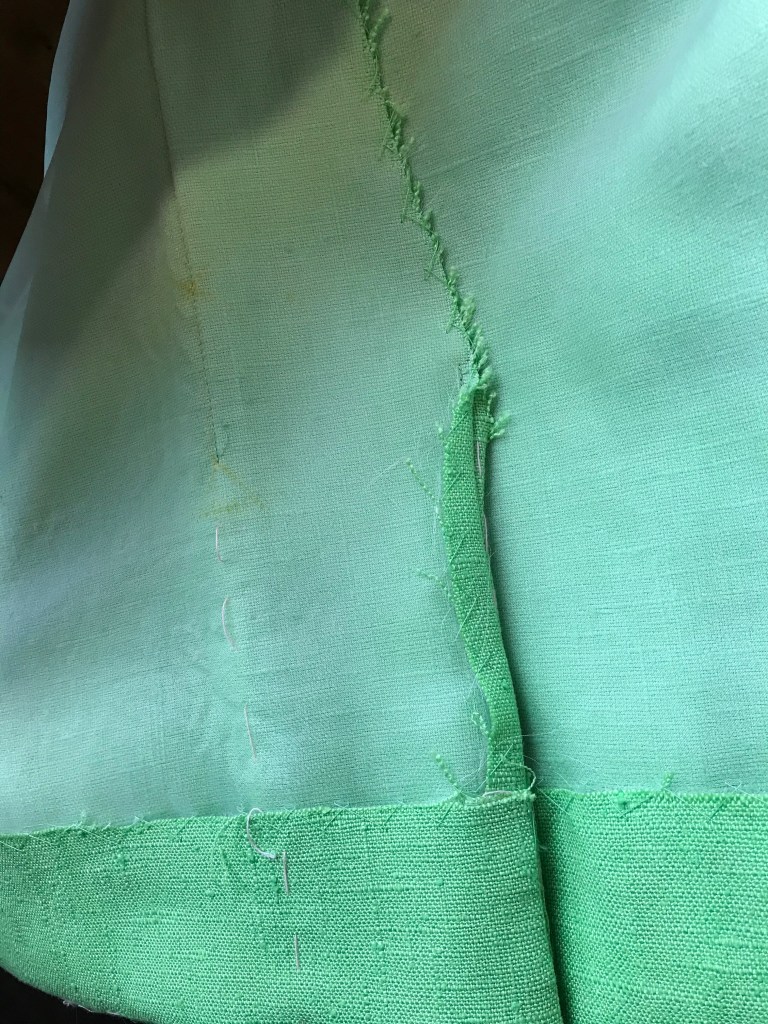 Now this is where it gets interesting. A few weeks ago I saw a vintage dress on a Facebook/Meta post by Xtabay Vintage Clothing Boutique. It is obviously Moygashel linen (I can tell by its weave and color), but what really caught my eye were the bias strips and low-profile bows adorning its sleeves. I tucked this idea in the back of my mind for future consideration. What I didn’t know was that the future was right around the corner! Yes – I “borrowed” this idea and added a single bias-cut bow to each sleeve. Somehow, it just seems to finish the dress.