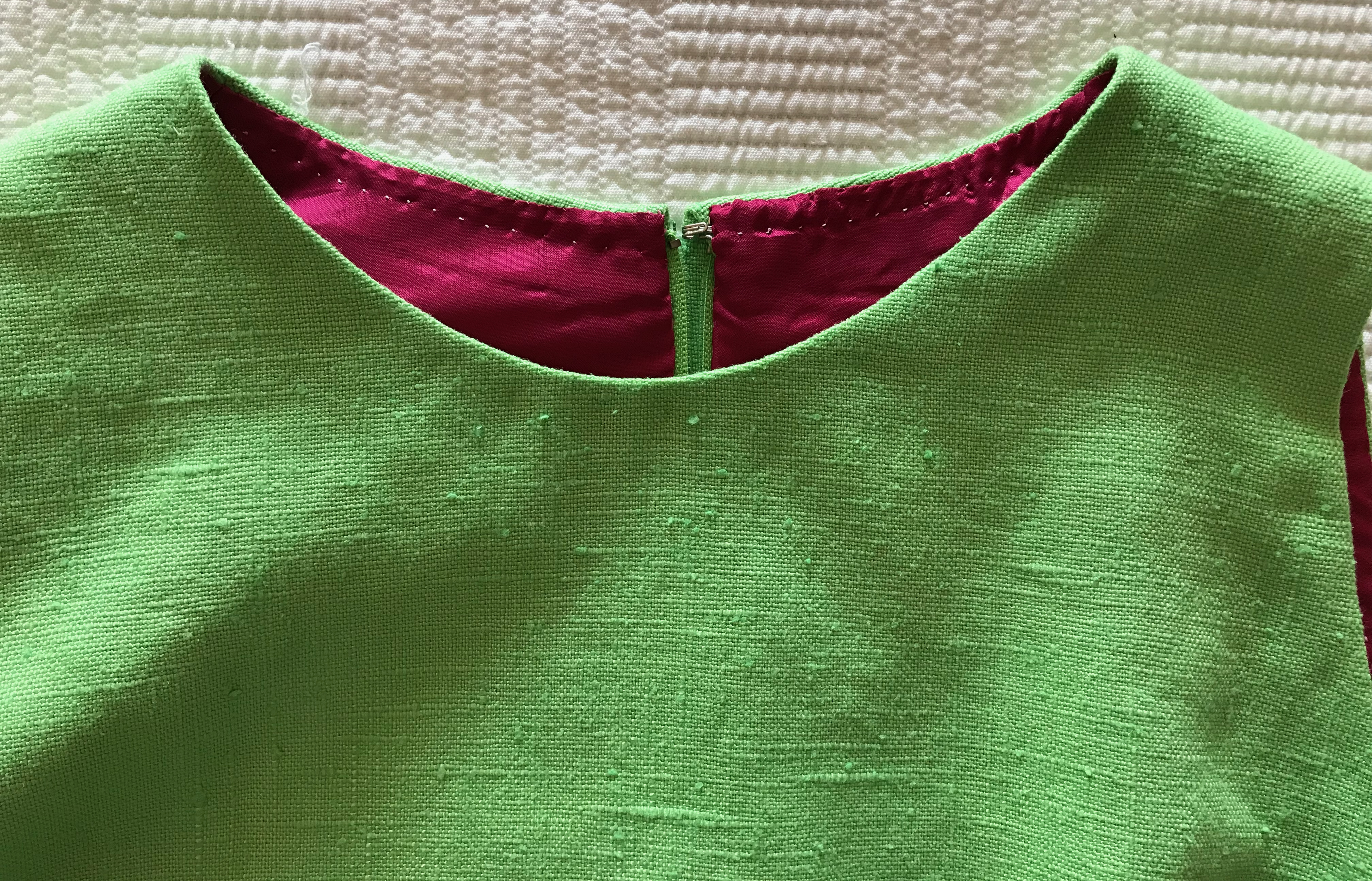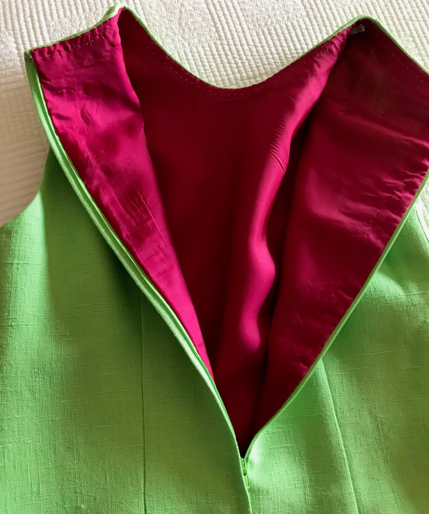 I underlined this dress in a very lightweight, pre-washed, cotton batiste, then I lined it in Bemberg rayon. Moygashel linen washes beautifully, as does Bemberg lining, which is why I chose Bemberg over silk for this dress. I eliminated the neckline facing, choosing instead to bring the lining up to the edge of the neckline seam, then under-stitching it to secure that edge in place.