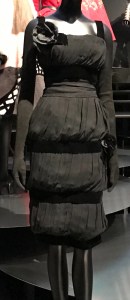Of all the gorgeous Balenciaga cocktail dresses out there (and many surely owned by the Met), this example on the right, looked a bit dowdy to me. From 1963-64, it was “hand-sewn black silk machine-embroidered lace, hand-applied self-fabric flounces and silk satin bows.” The dress next to it is by Simone Rocha (Irish, born 1986), 2014, “Wet Lace Frill Dress,” so called by the use of nylon and polyester laminated with polyurethane foil, which evokes a wet look!