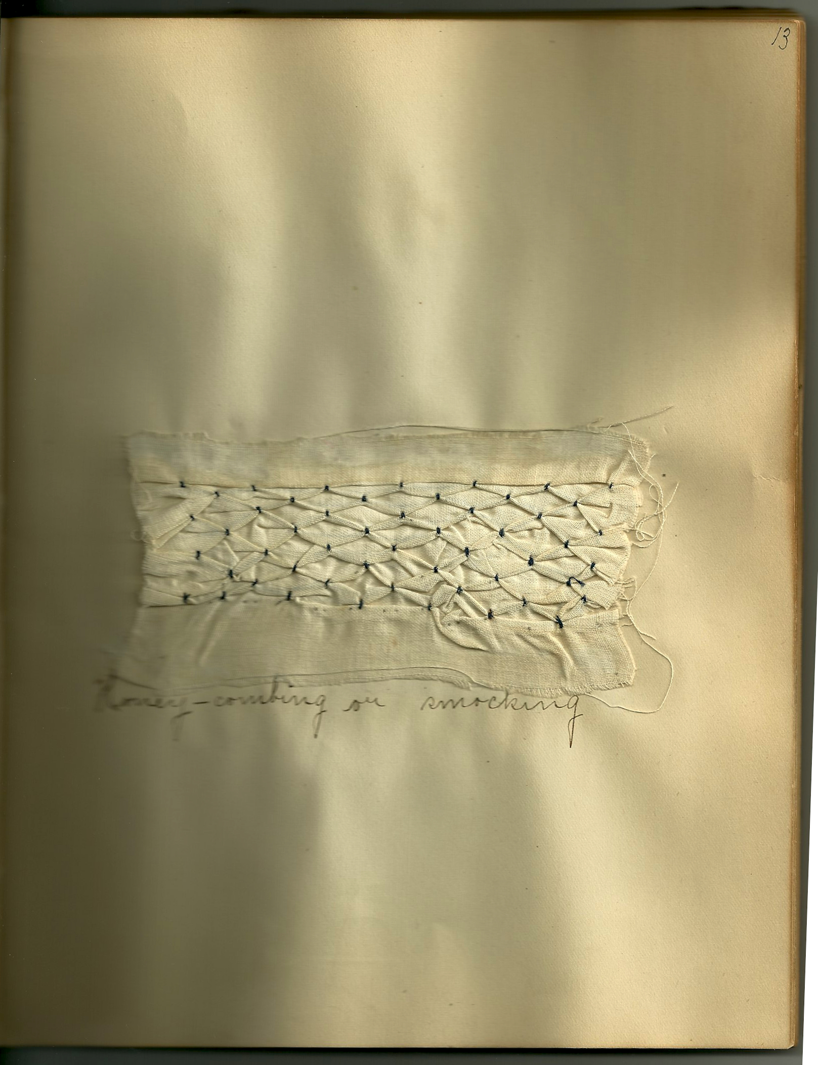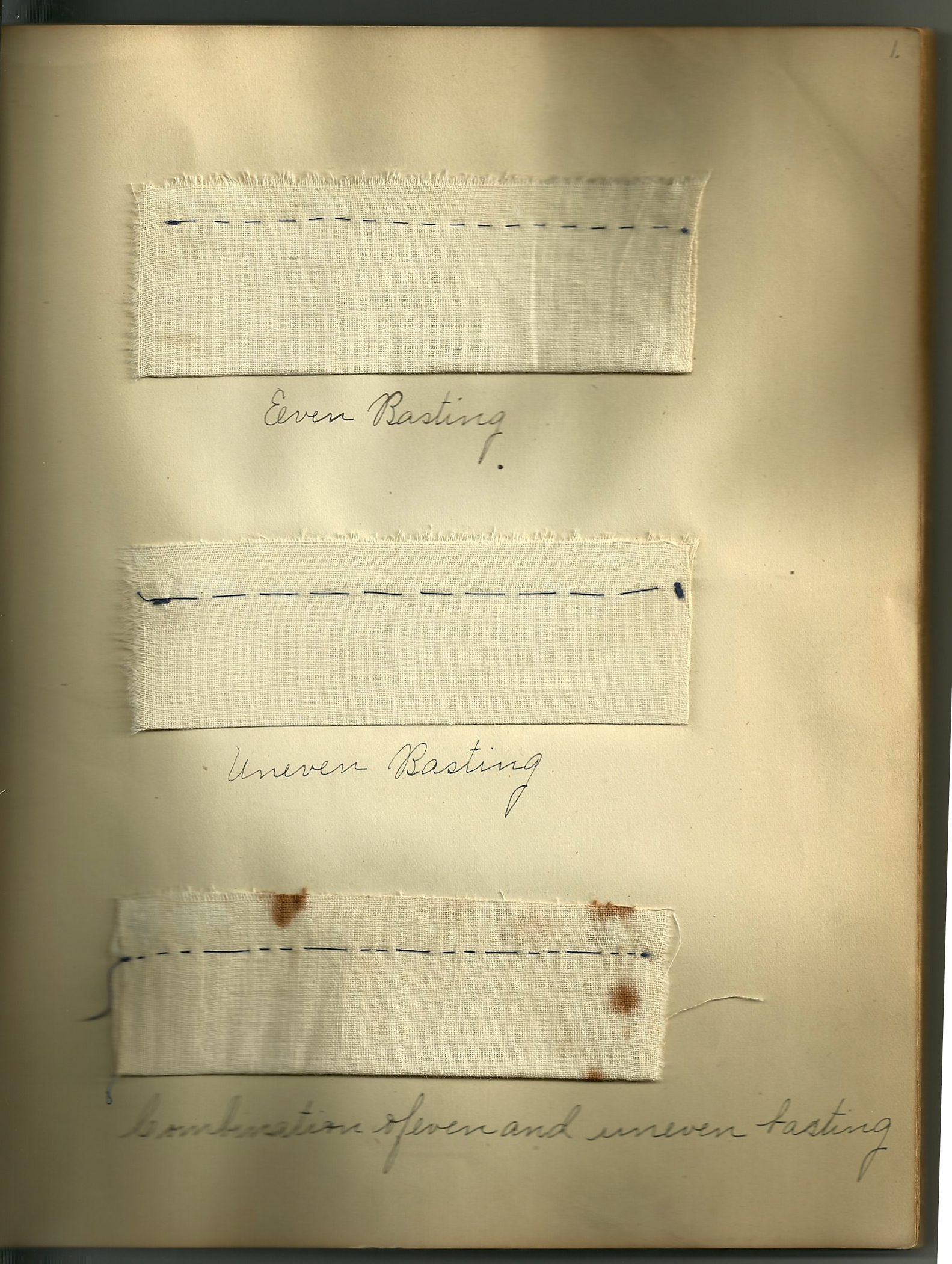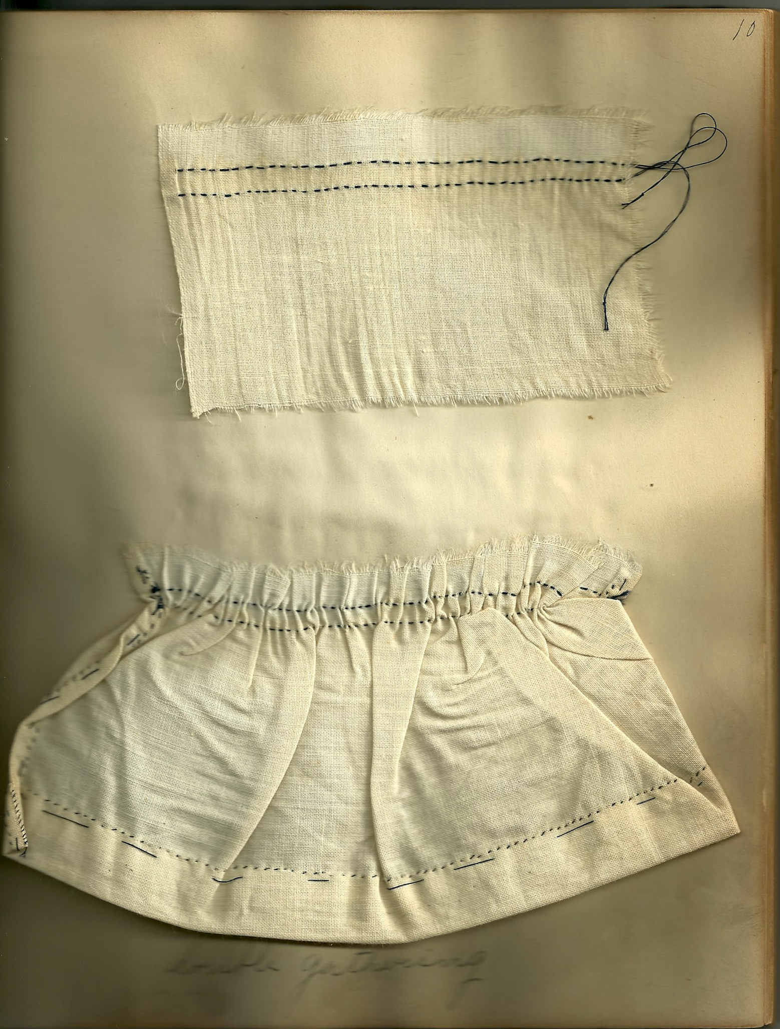 One section of the underlining cotton showing the maze of stitching required to attach the lace to the top of the skirt. Leaving the basting stitches in helps to orient the lace properly.