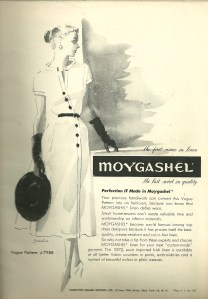 This full-page advertisement from the October/November 1953 Vogue Pattern Book Magazine features the label current at that time. It is probably a precursor to the label I received with my wool.