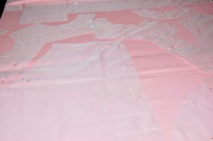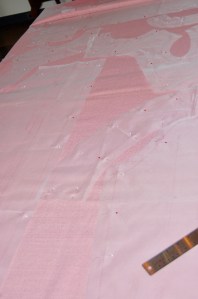 I quickly determined there was no way I could get the dress I wanted by placing the pattern on the lengthwise straight-of-grain. The flare of the skirt, which I wanted to be mid-calf, precluded any notion of such a layout. At 45” wide, I knew I could just get the dress length I wanted if I laid out the pattern on the cross-grain, from selvedge to selvedge. Linen is a very stable fabric, so I was confident the cross-grain would work. In addition, there were no directional limitations in the floral design of the fabric. Barely fitting my pattern – from shoulder to hem – on the fabric from selvedge to selvedge, however, would leave no extra fabric to turn up for the hem – or even to face the hem. I decided to worry about that later. First I wanted to determine how I could get the four pieces for the dress and the two lengthened sleeves placed on the fabric, keeping in mind three important things: 1) although this was not a fabric to be matched per se, the all-over design of the fabric needed to be on the same plane in contiguous seams; 2) I wanted to space out the larger floral motifs so the dress would be balanced as best as possible (looking critically at the dress I made when I was 23, I clearly could have given this more thought!); and 3) I wanted to avoid large demonstrative blooms at the bust. Then, and only then, would I worry about the hem.