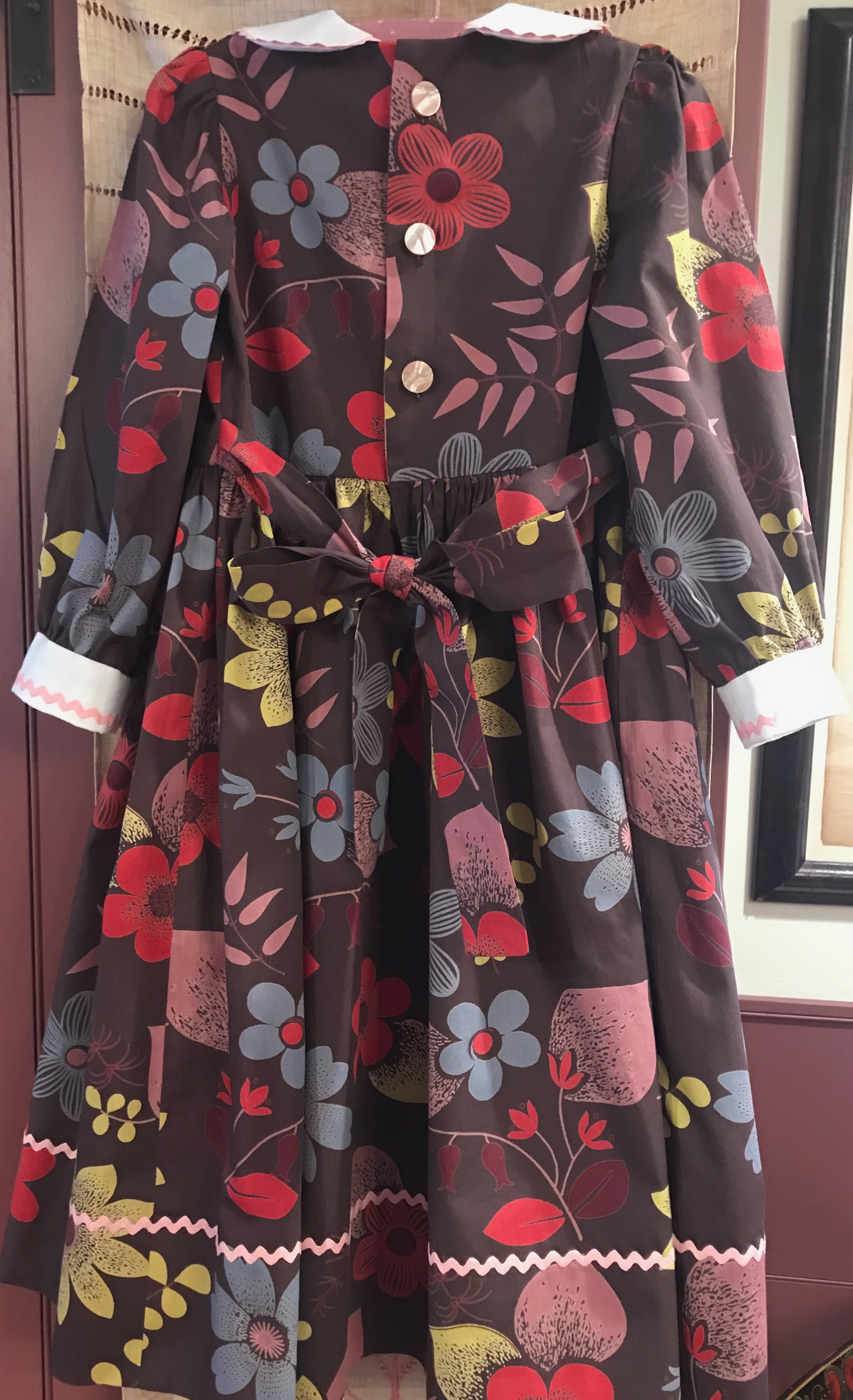 Once I was happy with this placement, I had a eureka moment when I knew I could accomplish two things with a simple bias trim made from the yardage of deep pink linen which coordinated nicely with the floral. 1) I could preserve the full 45” of cross-grain length by applying bias trim to the hem edge instead of turning it under, and I could do the same with the sleeves. And 2) the trim would add interest to the dress, just as I had vaguely imagined. (A quick aside here – I have ample yardage of the solid deep pink linen to make a coordinating coat at some point. Every dress needs a coat, right?)