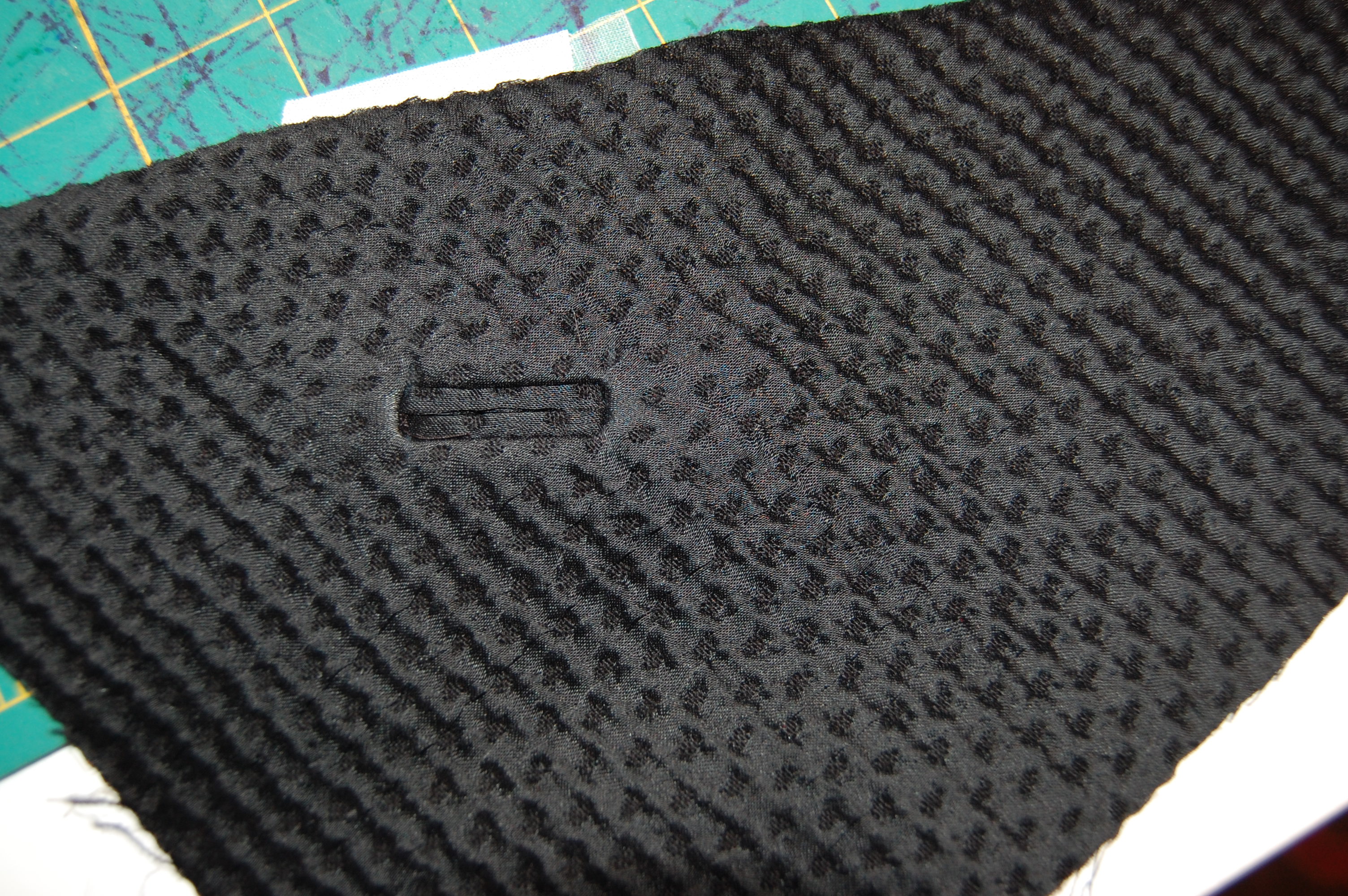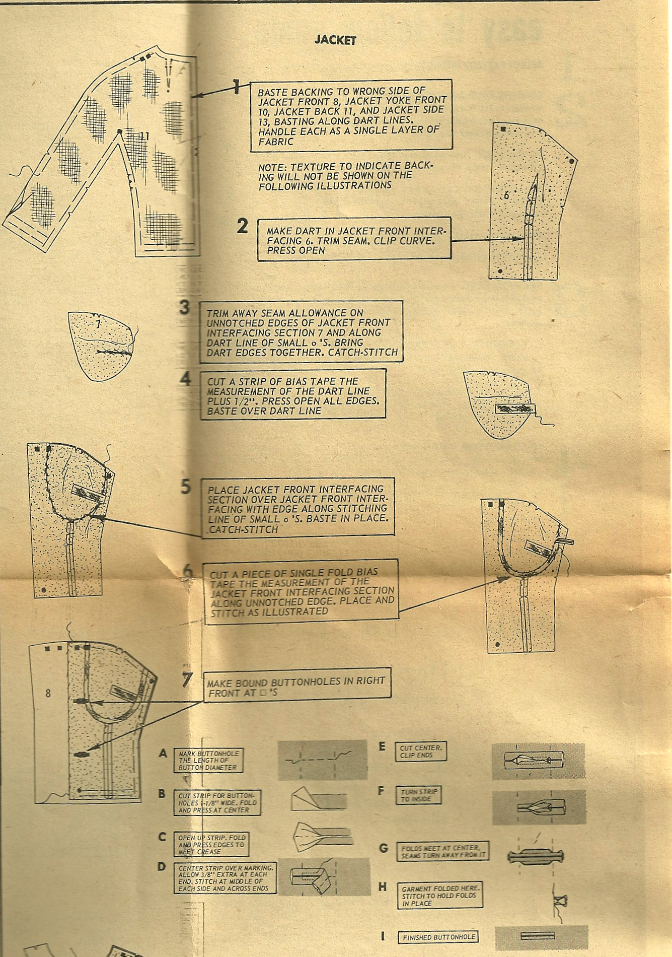 Note also the detailed instructions for making the bound buttonholes on the above instruction sheet. I did a practice run on a bound buttonhole, being careful to layer the fabrics exactly as they would be layered on the front of the jacket.