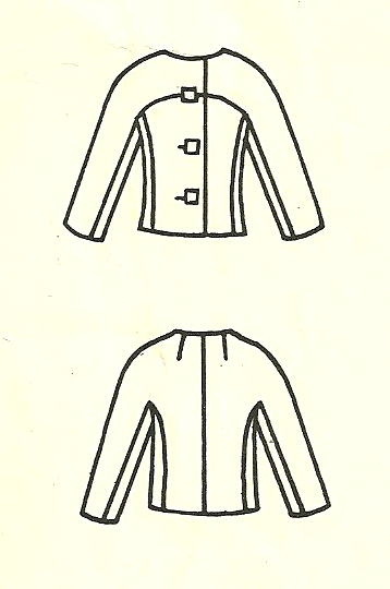 To quote:  “… a pure green with perfect pitch for day or evening, town or country.”  This particular design is by Michael of England, but, like the Vogue pattern I am using, it has a fitted jacket with a narrow notched collar, and three-quarter sleeves.