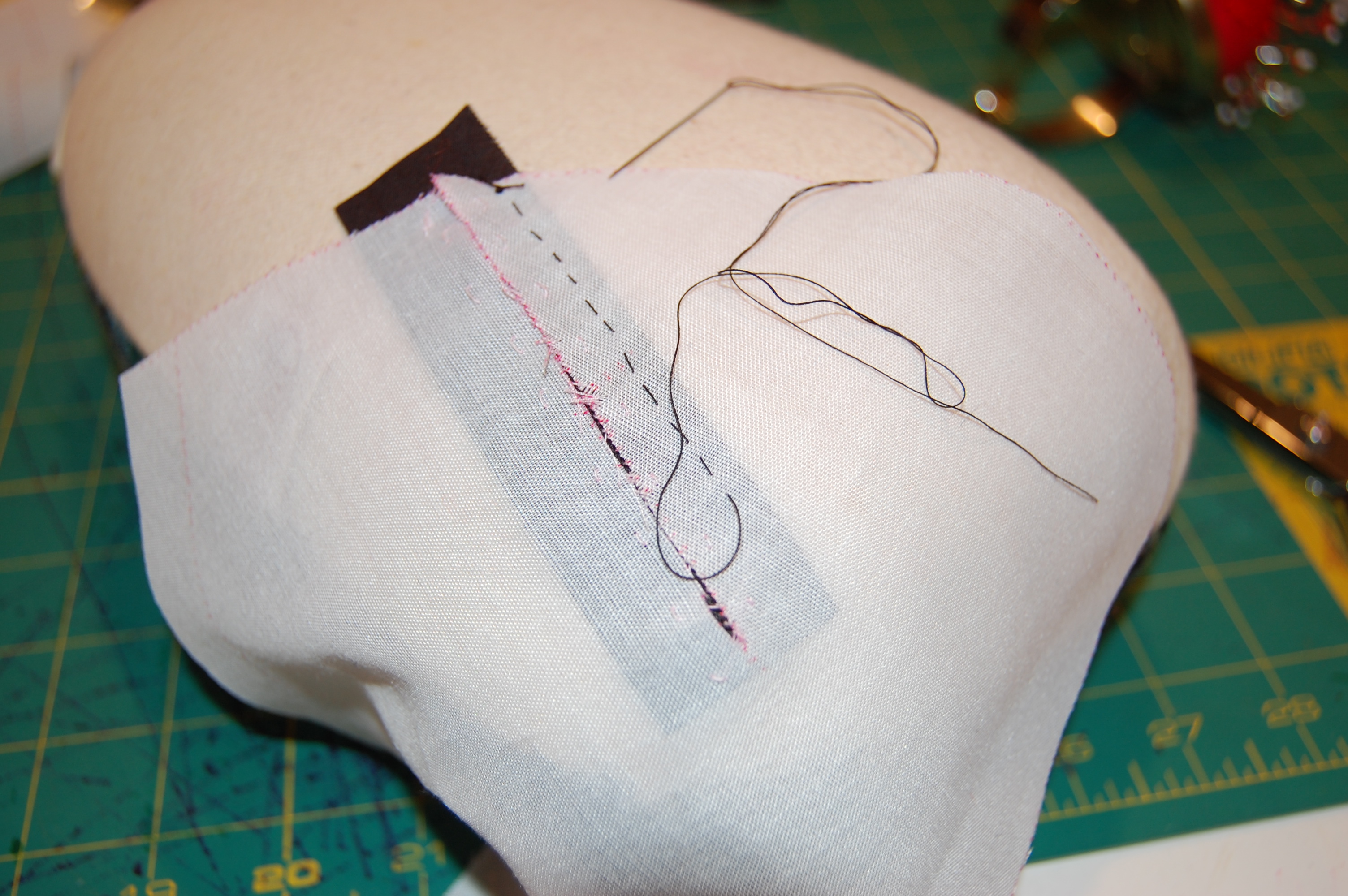 Here I am reinforcing the darts in the bust (cup) interfacings.