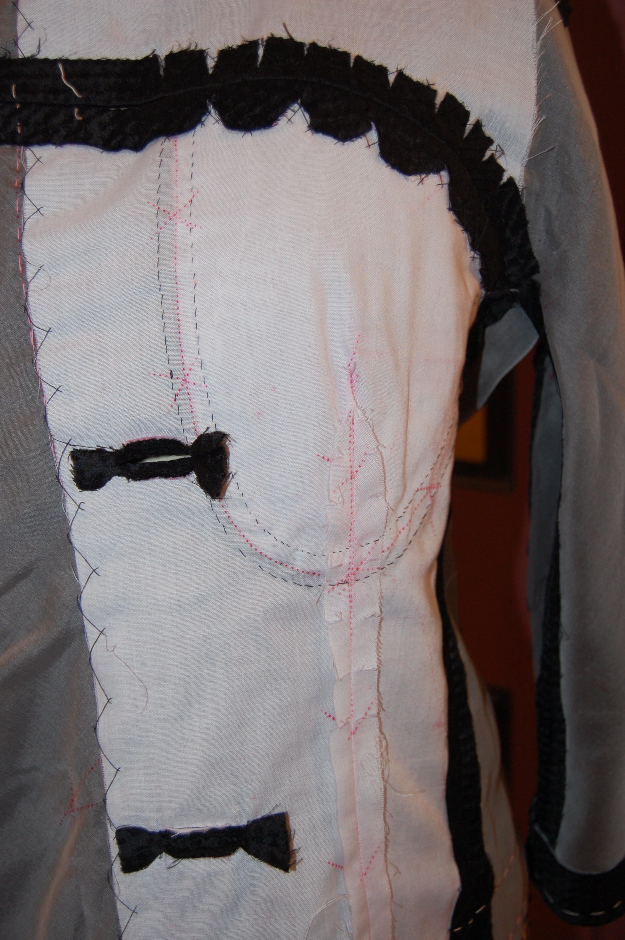 Thje front of the jacket. Note the “stays” made out of seam binding. They are loose except where they are attached at the underarm and at the neckline.
