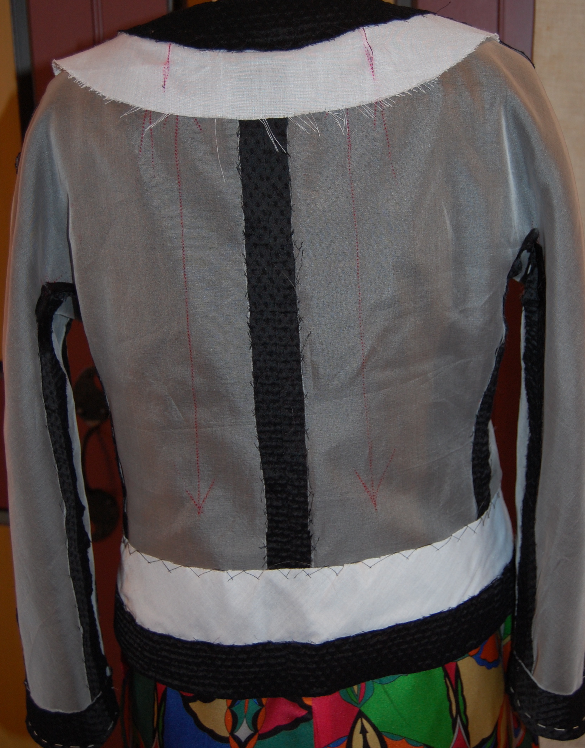 I am using black silk organza for the interfacing.  This is what I did on my color-blocked coat, under Susan Khalje's tutelage, and I was delighted with the results!
